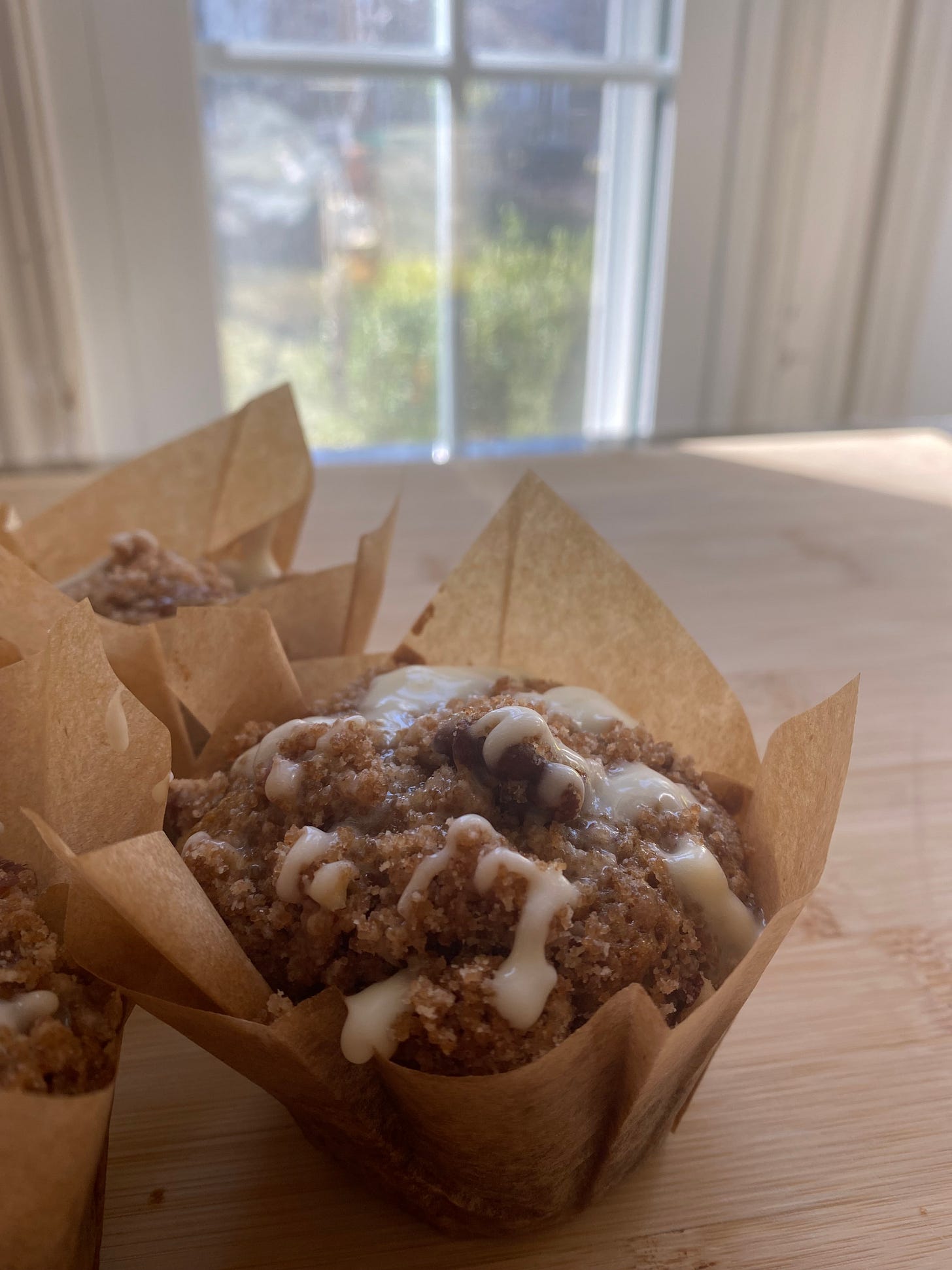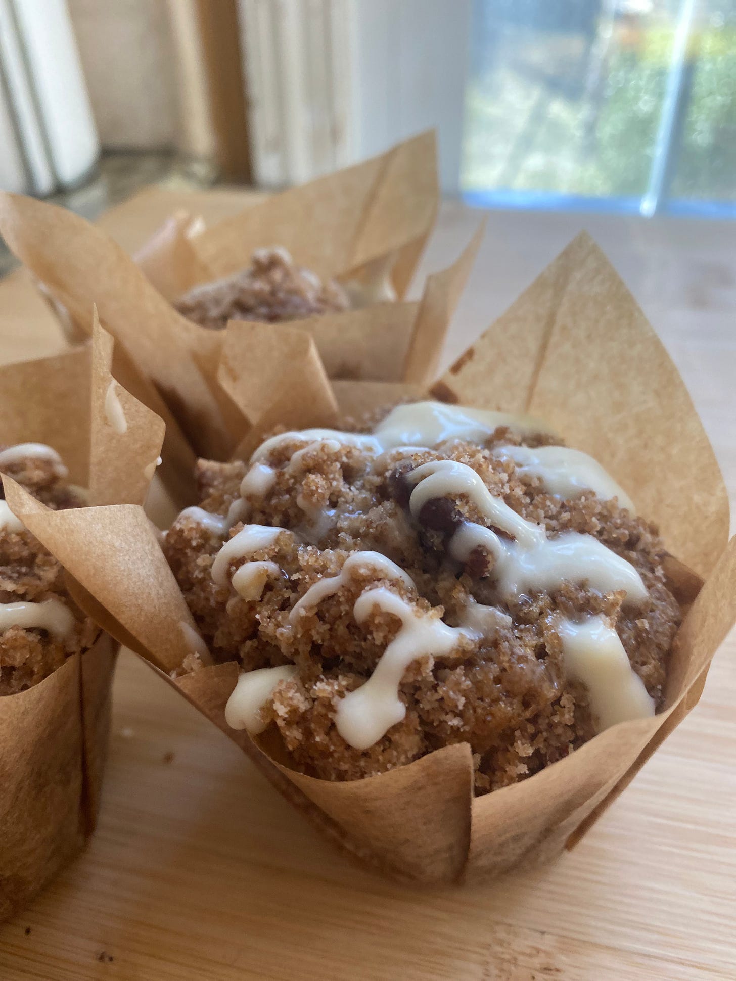 Let the muffins cool completely in the tin set on a wire rack. Once they are cool, take the drizzle out of the fridge and drizzle it with a spoon over the muffins (if you drizzle while they are warm, it might soak in, but it will still taste good). Enjoy!